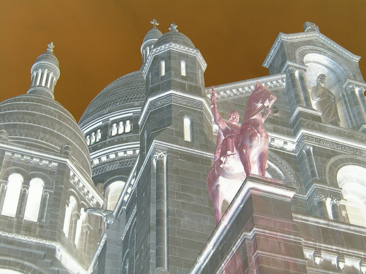 | A funky picture of the front of Sacre Coeur. Finished in 1919, Sacre Coeur is the center of the busy Butte de Montmarte neighborhood. |