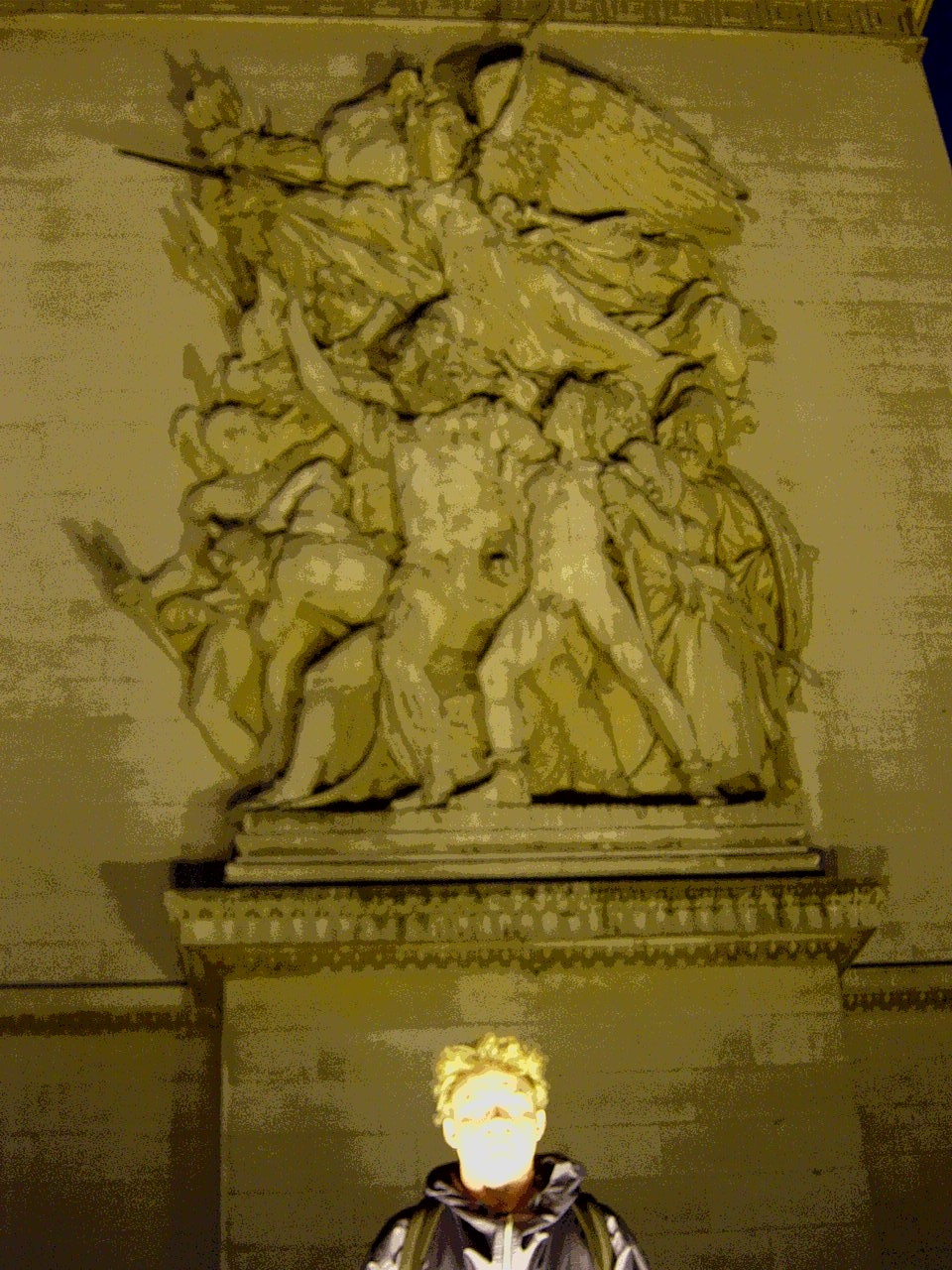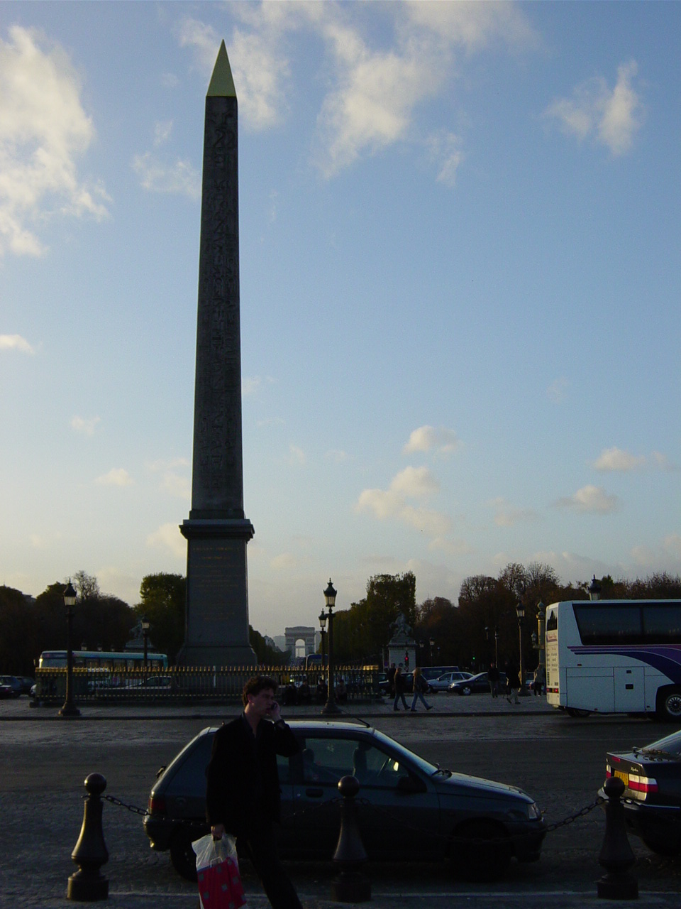 | Upon leaving the Lourve, we walked north-west through the Jardin de Carrousel and the Jardin de Tuileries. That's where we saw the Obelisque on the Place de la Concorde. This afforded a great view of the Eiffel Tower. We left Concorde up the Champs Elysees to the Arc de Triomphe. After a brief rain shower, we got some great shots of the Arc and the Eiffel Tower in the distance. |