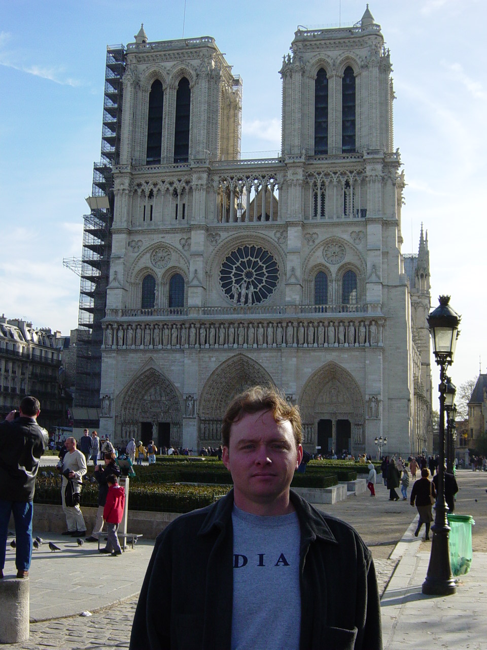 | Here I am in front of Notre Dame. The climb took us to the top of the left tower. We then walked between the towers and climbed down the right tower. |