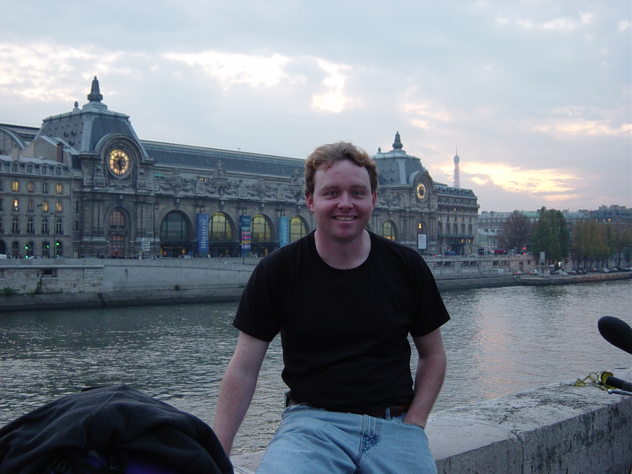 | We blitzed through the Orsay. The Orsay was a train station in the past. Here I am relaxing on the Seine with the Musee D'Orsay in the back. |