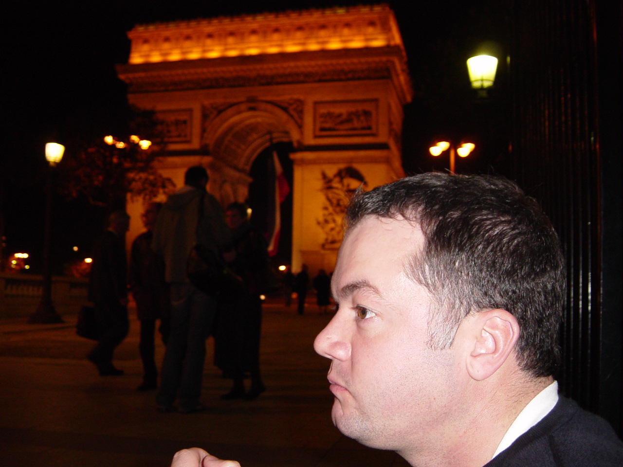 | On this particular night there was a massive French flag above the soldier. |